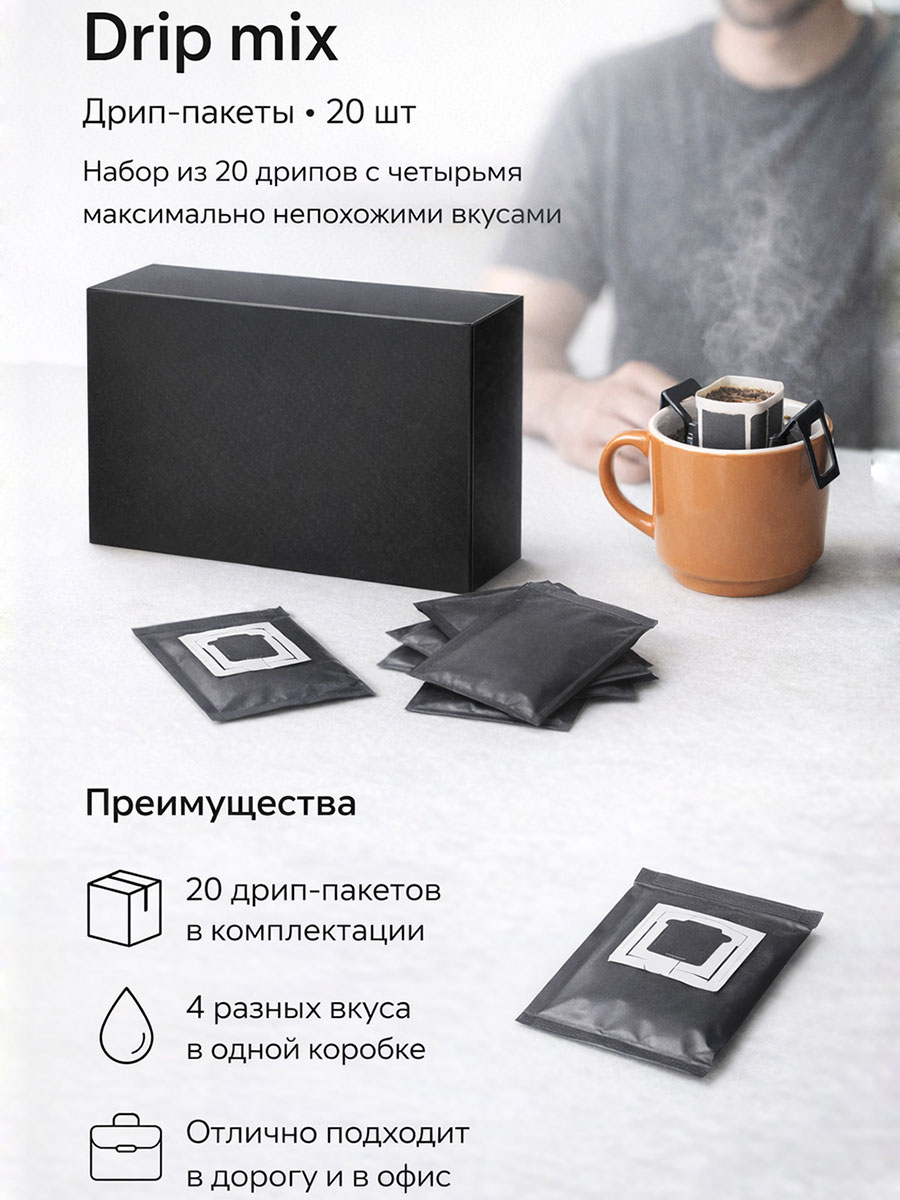 Главное преимущество нашего набора — возможность приготовить качественный черный кофе в любых условиях. Вам не нужно покупать дорогостоящую кофемашину, воронку или турку. Дрип-пакет — это портативная кофейня, которая всегда с вами.