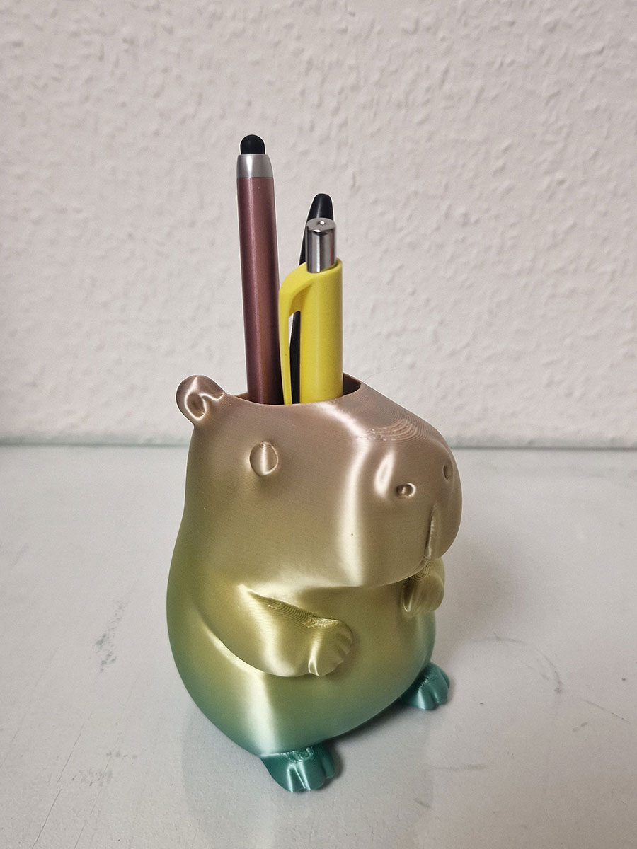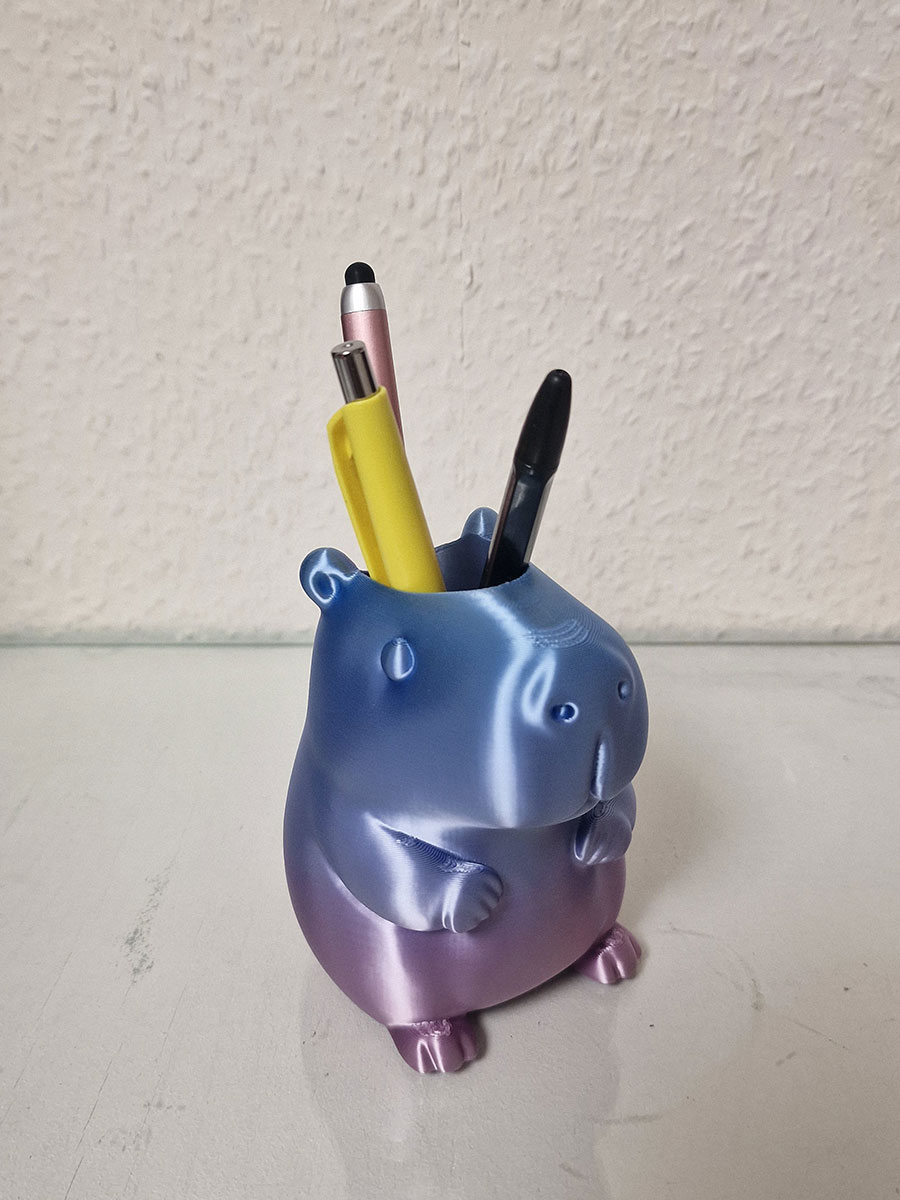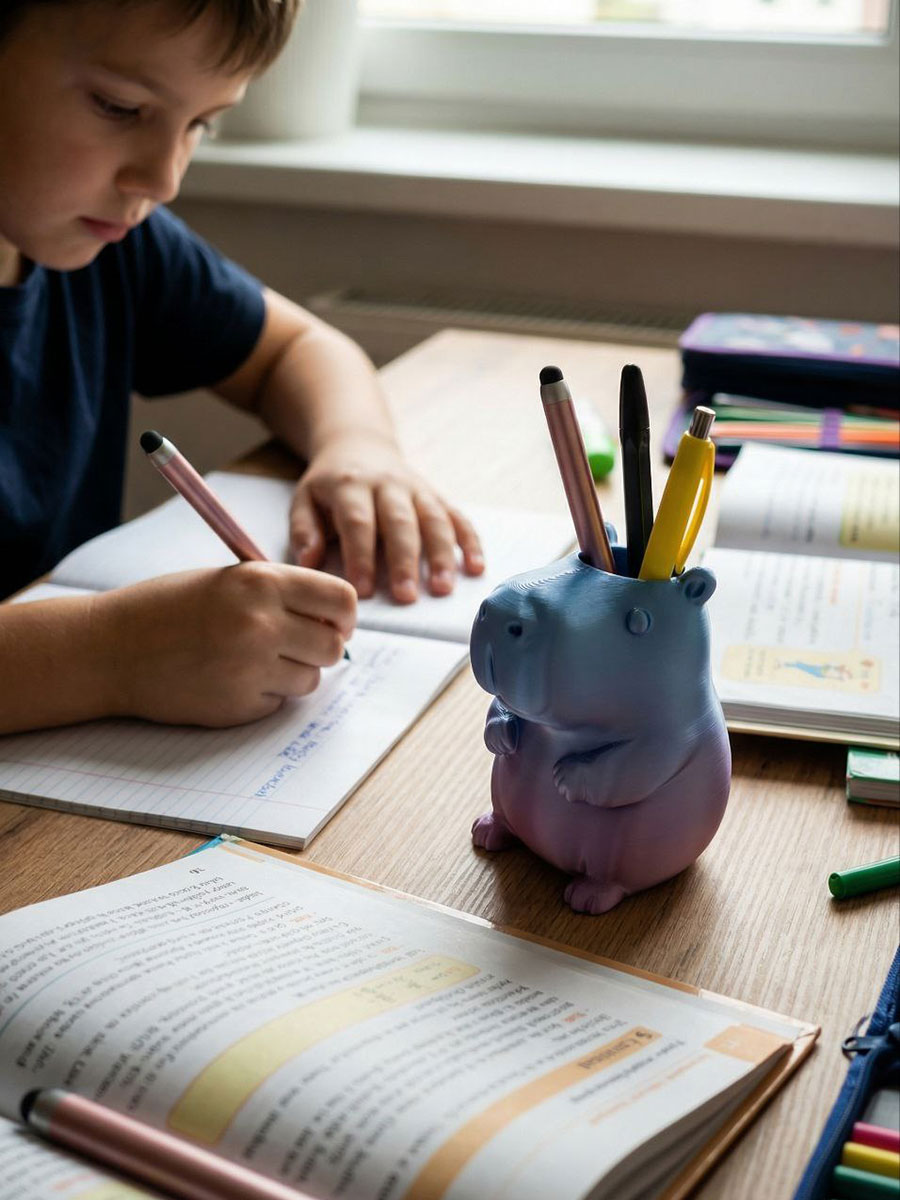 Подставка для ручек (карандашница) «Капибара» — стильный и практичный аксессуар для дома и офиса. Модель выполнена методом 3D‑печати из экологичного многоцветного PLA Silk — материал с шелковистым блеском, приятной текстурой и высокой прочностью для повседневного использования.
