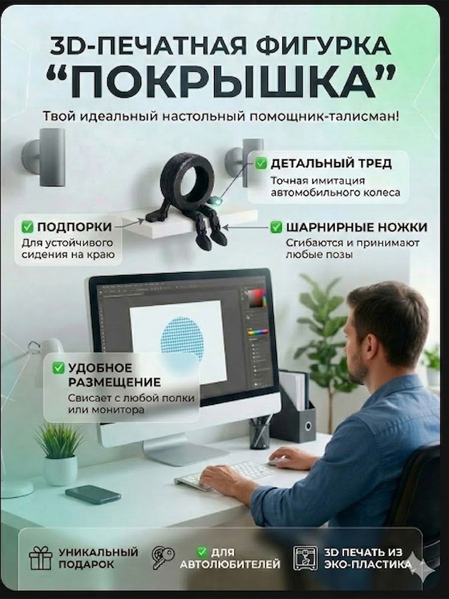 Покрышка с гибкими ножками — это ироничный и стильный аксессуар, который точно оценит каждый, кто не равнодушен к автомобилям. Фигурка представляет собой реалистичное колесо с протектором, у которого есть «характер» и полностью подвижные ноги. Благодаря шарнирным сочленениям, ваш новый «шинный бро» может сидеть, свесив ножки, или принимать забавные позы на вашем столе.