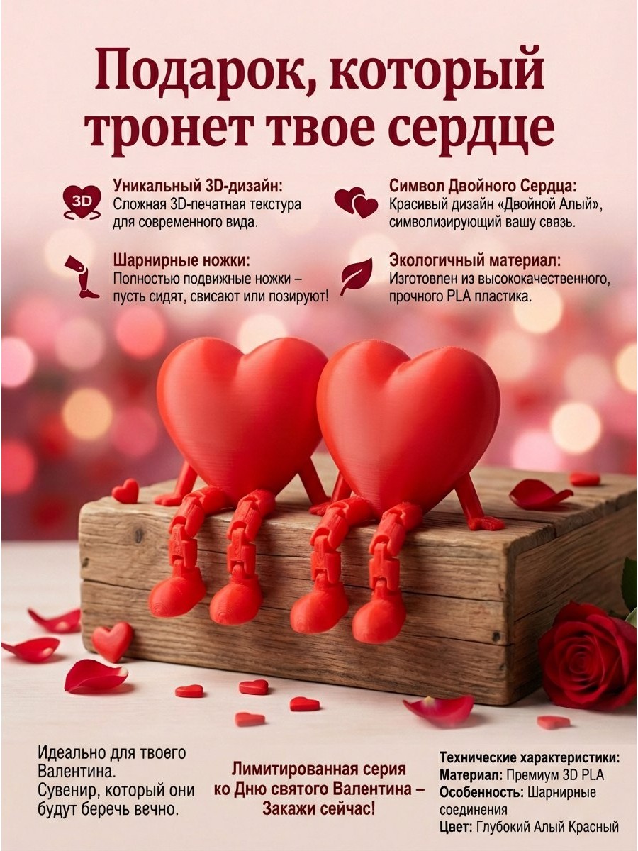 3D валентинка подарок сердце двойное алое с подвижными ножками